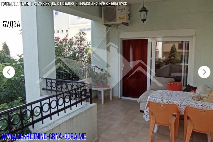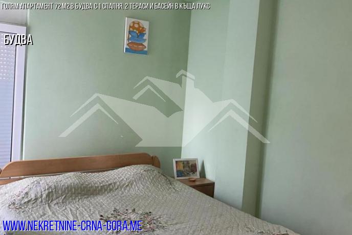 Апартамент с 2 спални в клубна къща с басейн в Будва. Светъл и просторен апартамент, люлеещи се прозорци към двора и планината, панорамни прозорци в хола.