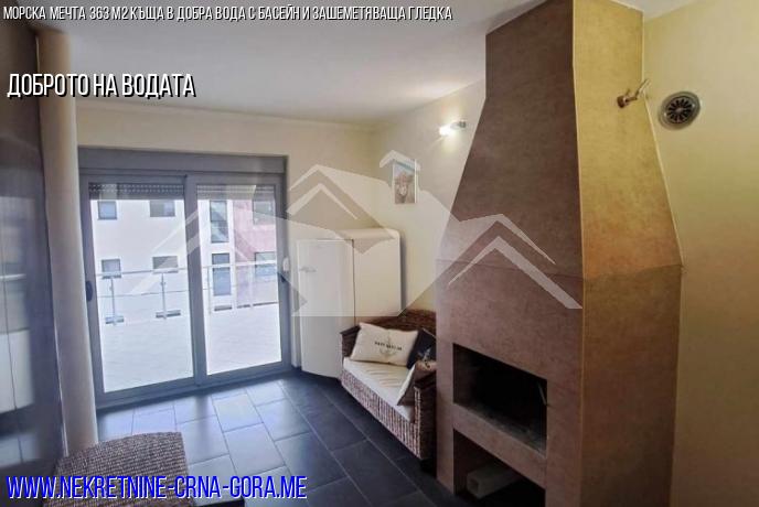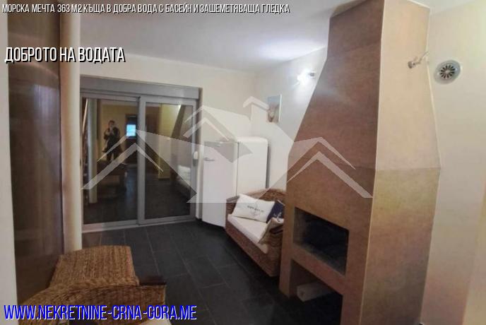 Къщата разполага с две дневни, кухня, четири спални, две бани и три тераси с изглед към морето и планината. В хола има камина.