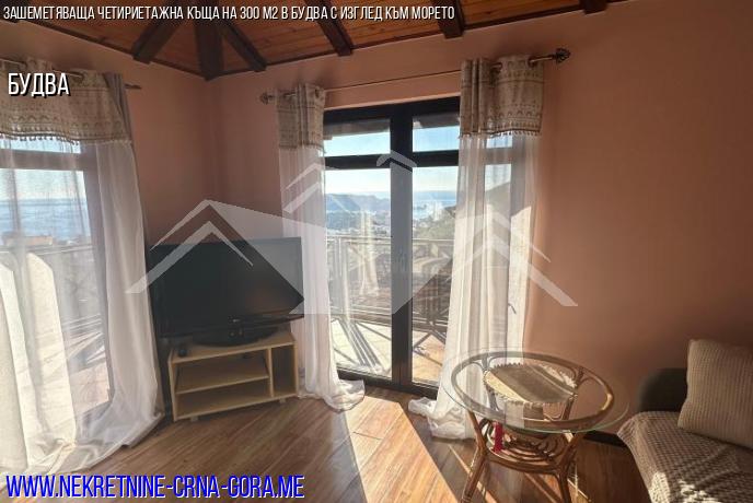 Четвърти етаж: стая с отворен план с панорамно остъкляване и достъп до три тераси, включваща дневна зона с мека мебел и телевизор, зона за спане и кабинет. Има и баня.