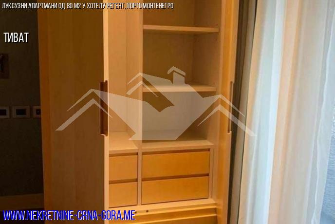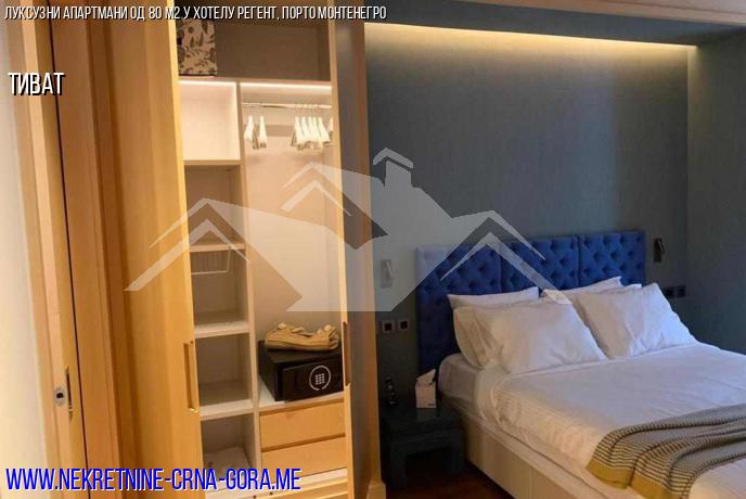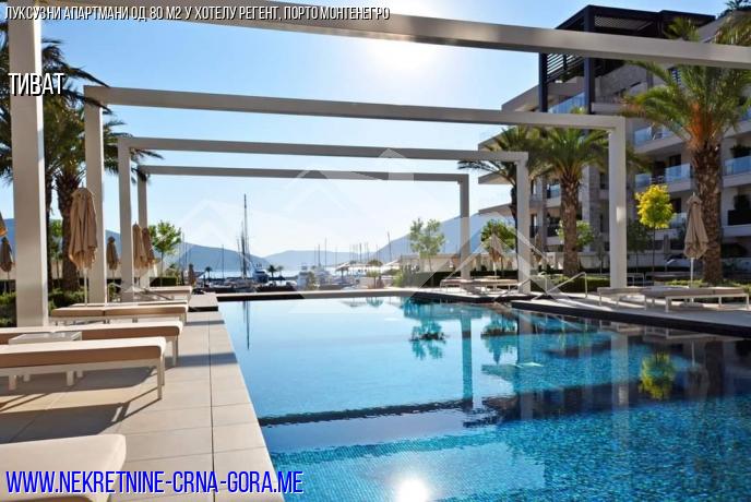 Продаје се стан од 80 м2, једна спаваћа соба и тераса која гледа на велики базен и марину. Стан се налази у приземљу хотела регент, који се налази у срцу чувене марине за јахте Порто Монтенегро.