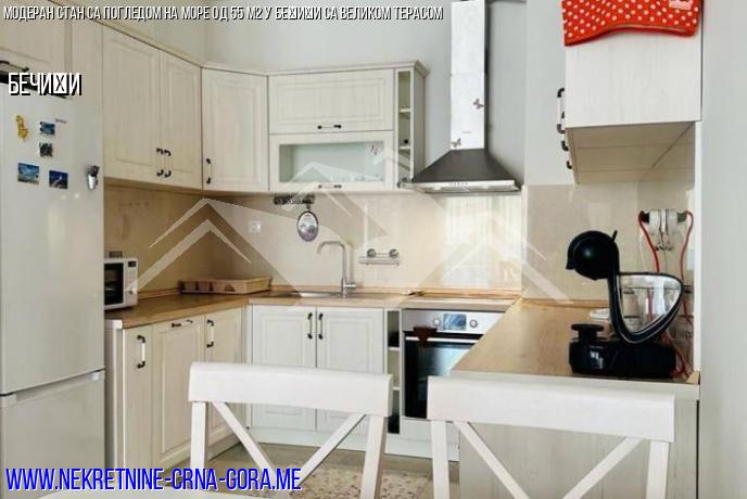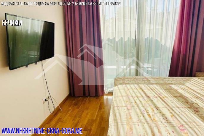 Нови округ Бечићи, модерна нова зграда. Веома добар једнособан стан са бочним погледом на море и великом терасом од 20 квадратних метара. Лифт.