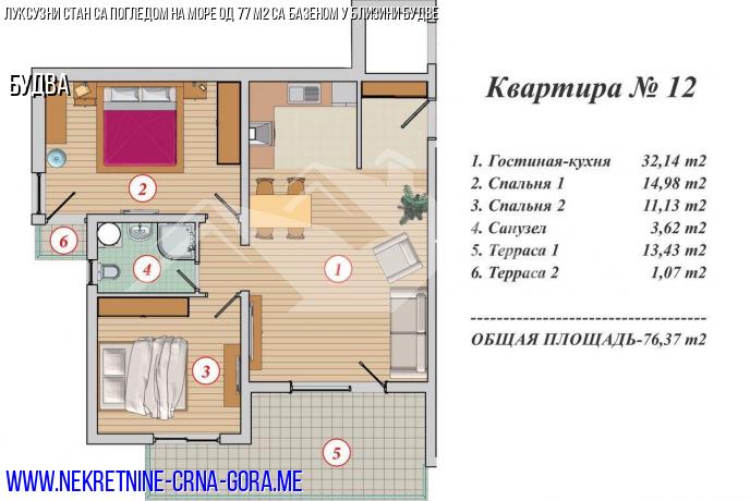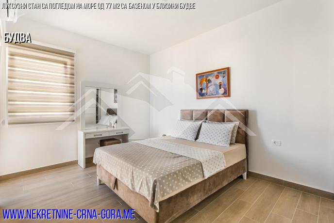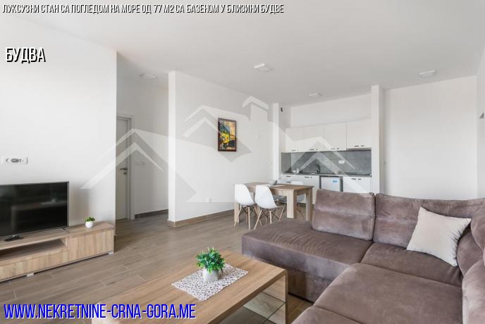 Двособан стан на продају у новом стамбеном комплексу са базеном и невероватним погледом на море у мирном предграђу Будве. Простран и светао стан од 77 квадратних метара, у потпуности опремљен намештајем и модерним кућним апаратима, укључујући клима уређаје, подно грејање, ЦЦТВ систем, интернет и ТВ. Стан има отворени дневни боравак са кухињом и трпезаријом, 2 одвојене спаваће собе и велику терасу.