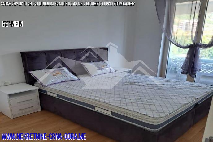 Једнособан стан са погледом на море и базен у Бечићу. Плошта станова је 48 квадратних метара, налази се на 8.спрату. Пространа тераса, одличан поглед на море и планине. Опремљена је свим неопходним стварима. Међу доступном опремом: машина за прање веша, Машина за прање судова, фрижидер, електрични шпорет, електрични чајник, усисивач, ТВ (смарт), два клима уређаја.