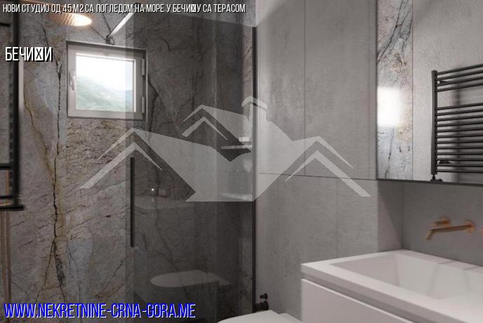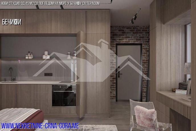 Стан-студио у новој згради, са готовим дизајнерским пројектом, налази се у мирном спавачком округу Бечичи. Стан је 600 метара од мора.
