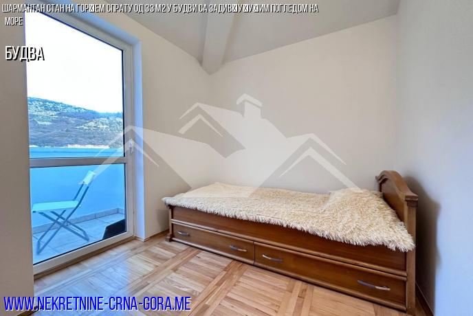 На продају је удобан 33 м2 једнособан стан у Будви, који се налази на последњем спрату петоспратне куће у области Плавог моста.