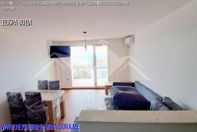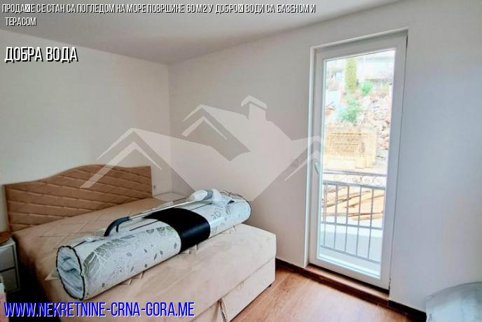 На продају се нуди стан са 1 спаваћом собом Добра Вода на првом спрату у новој четвороспратној кући.