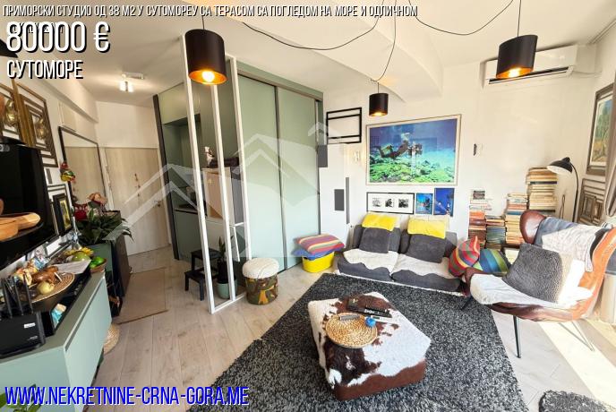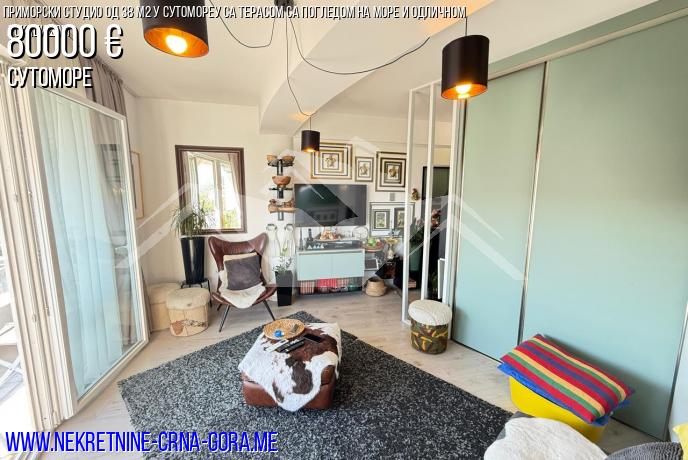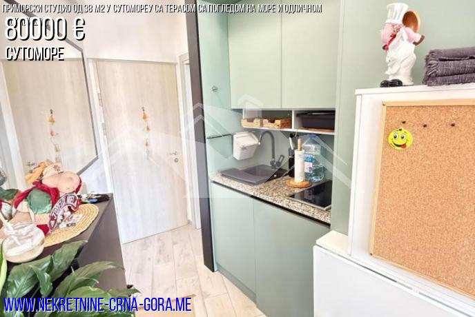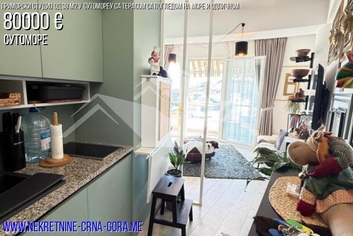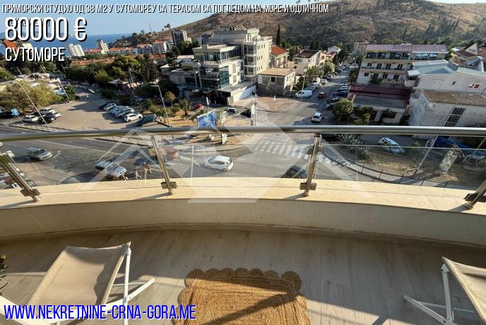 На продају је удобан студио од 30 м2 са терасом од 8 м2, само 38 м2, у срцу града Сутоморе са прелепим погледом на море. Удаљеност до плаже је само 500 метара.