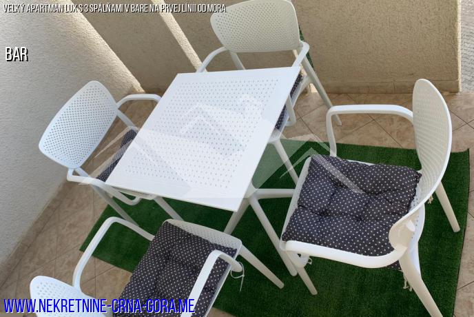 Na predaj zariadený byt 90m2 (zapísaný v katastri 75m2, okrem 2 balkónov), s 3 spálňami, 2 kúpeľňami, obývacou izbou a samostatnou kuchyňou v prvej línii od mora v bare.