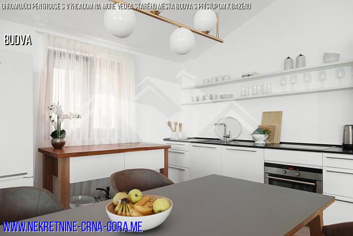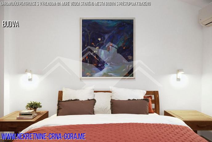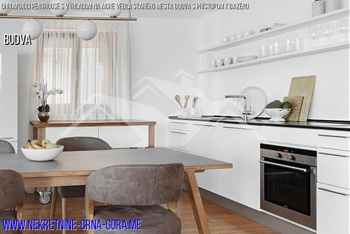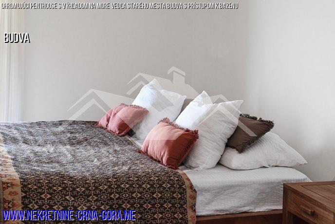 Byt sa nachádza na štvrtom poschodí komplexu a pozostáva z priestrannej obývacej izby kombinovanej s jedálňou a kuchyňou, 3 spální a terasy s výhľadom na bazén, Staré Mesto Budva a ostrov St.Nikola. Panoramatické okná a zaoblená stena obývacej izby s jedinečným výhľadom vytvárajú dojem priestoru plynulo prúdiaceho do mora a horizontu. Harmonický moderný škandinávsky interiér bytu dokonale zdôrazňuje panorámu mora a hôr. Byt je vybavený všetkým potrebným na to, aby ste sa ihneď po kúpe usadili alebo ho začali prenajímať.