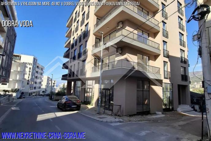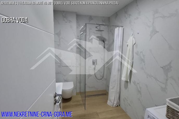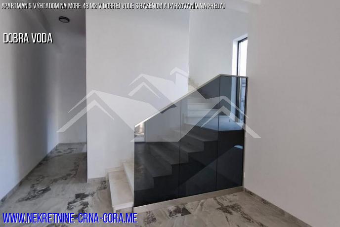 V hornej časti budovy sa nachádza bazén s panoramatickým výhľadom na more a okolie. Byt je vybavený kvalitným nábytkom a je vhodný na bývanie aj prenájom.