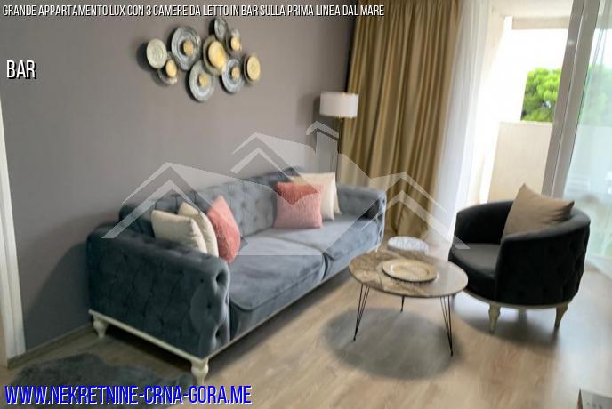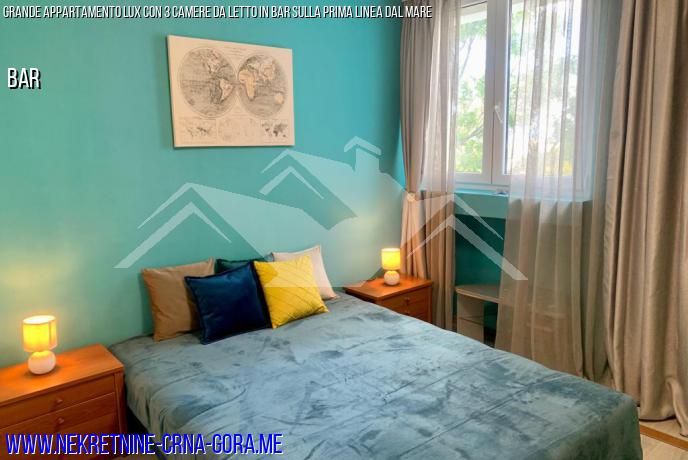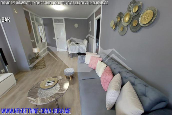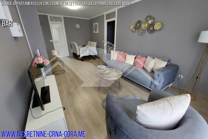 In vendita appartamento arredato di 90m2 (registrato nel Catasto di 75m2, esclusi 2 balconi), con 3 camere da letto, 2 bagni, soggiorno e cucina separata in prima linea dal mare al bar.