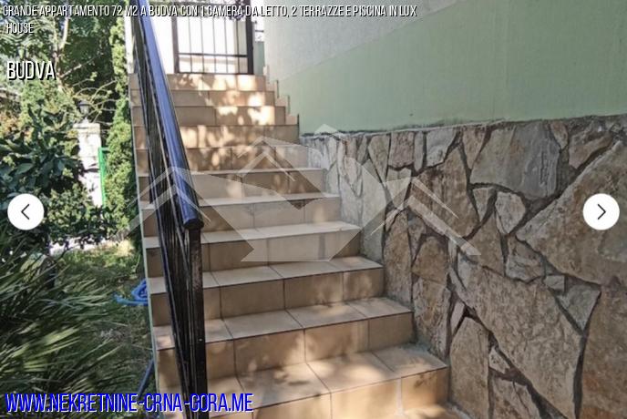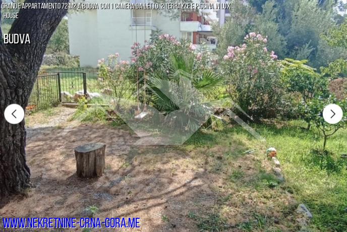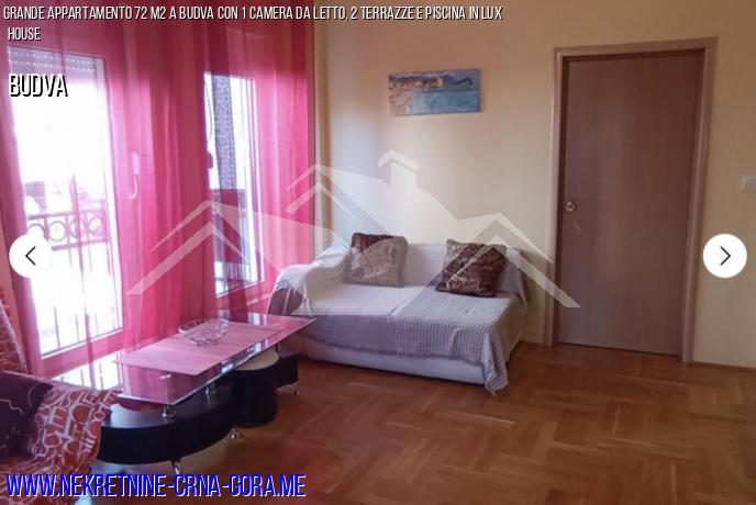 Appartamento con 2 camere da letto in una club house con piscina a Budva. Appartamento luminoso e spazioso, finestre a battente sul cortile e sulle montagne, finestre panoramiche sul soggiorno.