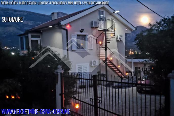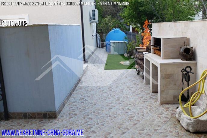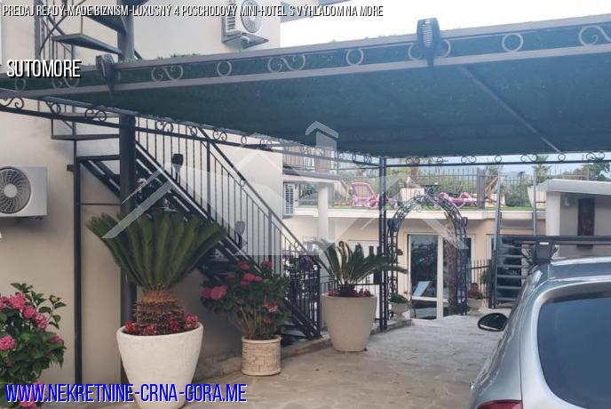 Na predaj funkčný mini-hotel pre 4 apartmány s bazénom, saunou, parkovaním pre 6 áut na útulnom, súkromnom mieste v Sutomore (Zagraj) s výhľadom na more a Hory ako hotový prevádzkový podnik. Dom je legalizovaný.