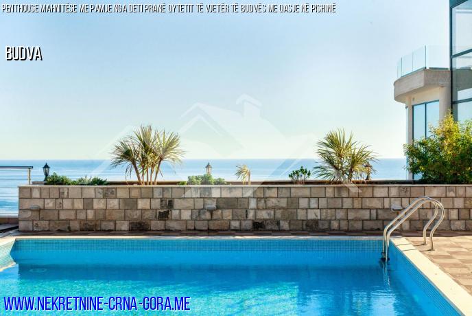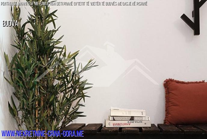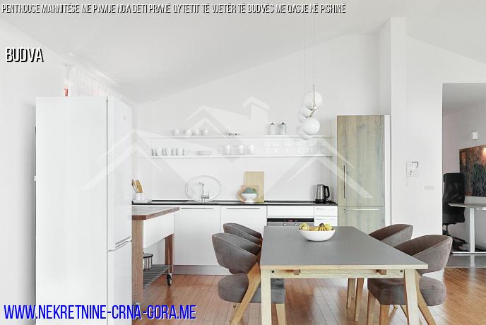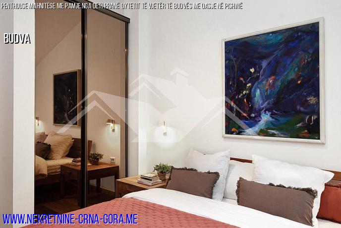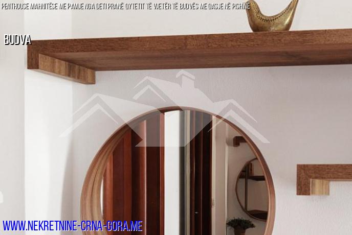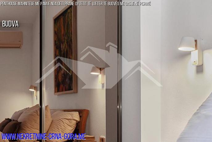 Apartamenti ndodhet në katin e katërt të kompleksit dhe përbëhet nga një dhomë ndenjeje e bollshme e kombinuar me një dhomë ngrënie dhe kuzhinë, 3 dhoma gjumi dhe një tarracë me pamje nga pishina, Qyteti i vjetër I Budvës dhe ishulli I Shën Nikollës. Dritaret panoramike dhe një mur i rrumbullakosur i dhomës së ndenjes me një pamje unike krijojnë përshtypjen e një hapësire që rrjedh pa probleme në det dhe horizont. Brendësia Harmonike Moderne Skandinave e banesës thekson në mënyrë të përkryer panoramën e detit dhe maleve. Apartamenti është i pajisur me gjithçka të nevojshme për t'u vendosur menjëherë pas blerjes ose për të filluar marrjen me qira të tij.