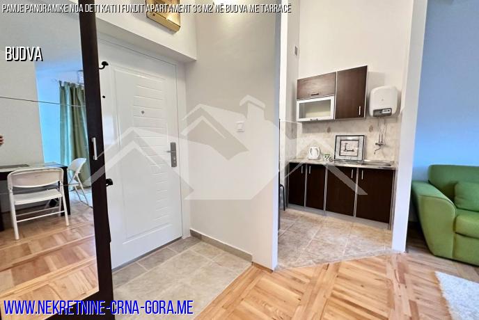 Apartamenti përbëhet nga një dhomë gjumi, një dhomë ndenjeje me një zonë të veçantë kuzhine, një banjo me vaskë dhe një tarracë me pamje panoramike Të Budvës dhe detit.