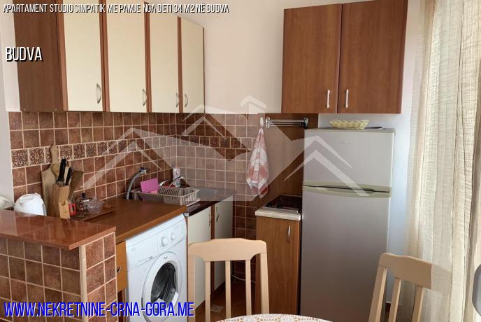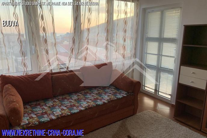 Shitet një apartament komod studio me një dhomë gjumi prej 34 m2 në Budva me një sallë hyrëse në katin e 3-të të një ndërtese 3-katëshe me një pamje të bukur të detit nga dritaret panoramike.