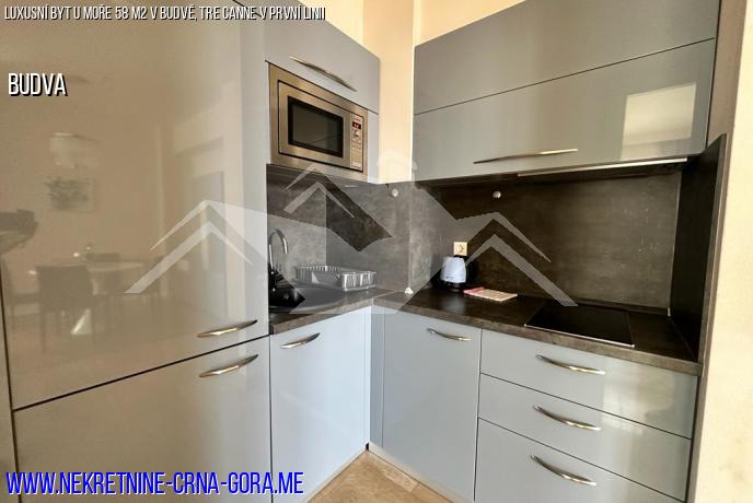 Struktura bytu kuchyň, obývací pokoj, jedna ložnice, koupelna a terasa s výhledem na moře