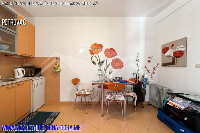 1 ložnice, velký obývací pokoj, kuchyň, terasa s bočním výhledem na moře.