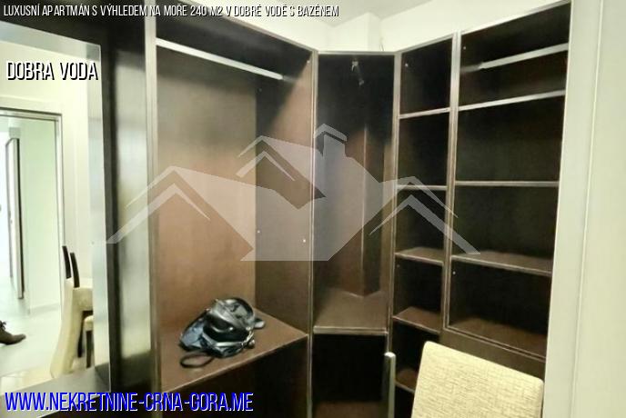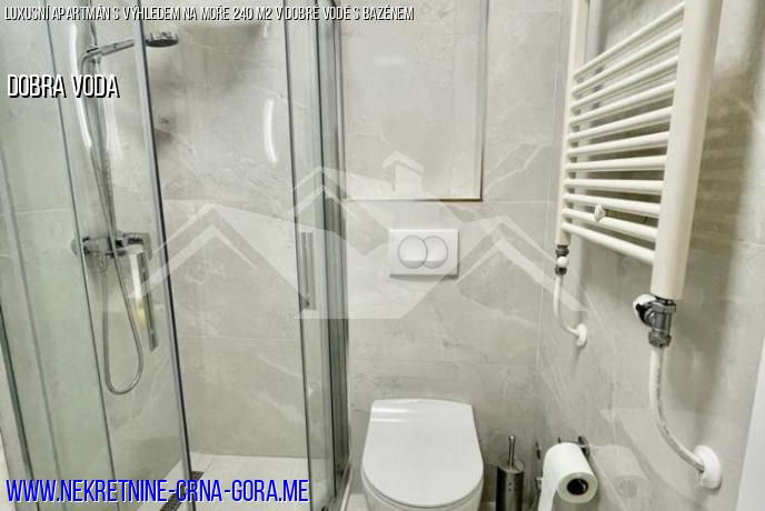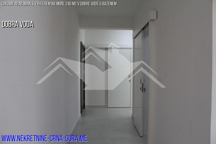 Plocha bytu je 240 m2. Skládá se z prostorného obývacího pokoje, 3 ložnic, 2 koupelen, šatny, velké panoramatické terasy s výhledem na moře.