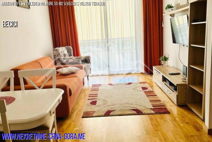 Nová čtvrť Bečice, moderní nová budova. Velmi pěkný jednopokojový byt s bočním výhledem na moře a velkou 20 m2 terasou. Výtah.