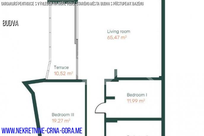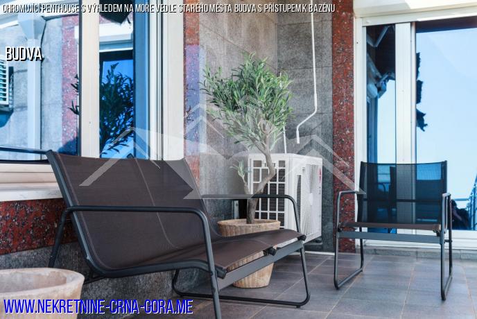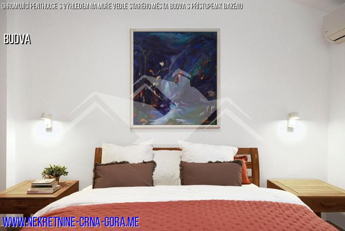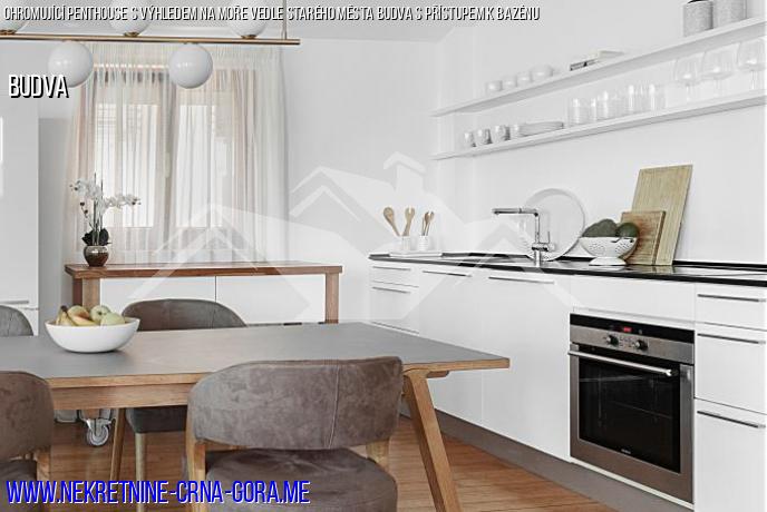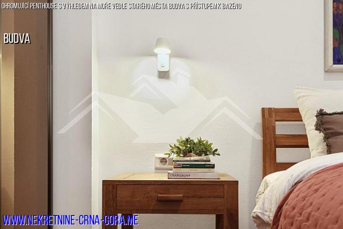 Byt se nachází ve čtvrtém patře komplexu a skládá se z prostorného obývacího pokoje kombinovaného s jídelnou a kuchyní, 3 ložnic a terasy, která se dívá na bazén, Staré Město Budvy a Ostrov sv. Mikuláše. Panoramatická okna a zaoblená stěna obývacího pokoje s jedinečným výhledem vytvářejí dojem prostoru, který plynule proudí do moře a panoramatu. Harmonický moderní skandinávský interiér bytu dokonale podtrhuje panorama moře a hor. Byt je vybaven vším, co potřebujete, abyste se ihned po koupi usadili nebo jej začali pronajímat.