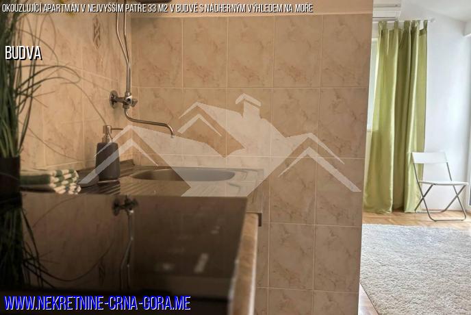 Na prodej je útulný 33 m2 byt v Budvě s jednou ložnicí, který se nachází v posledním patře pětipatrového domu v oblasti modrého mostu.