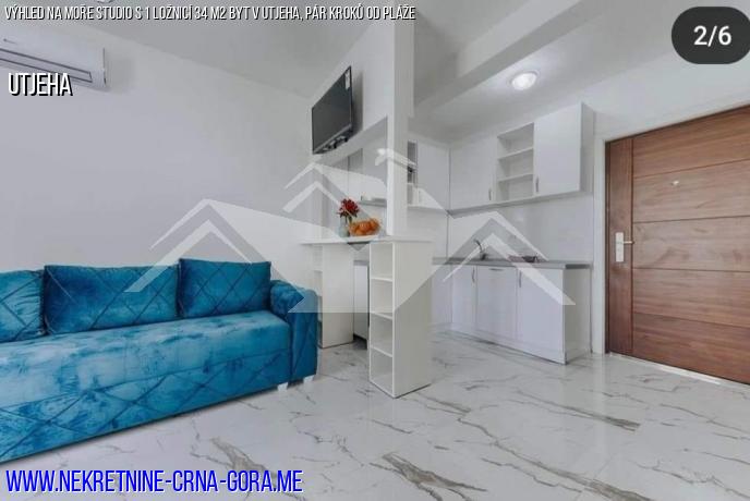 Byt se nachází ve třetím patře v pětipatrovém domě s výtahem. K moři 100 metrů-2 minuty pěšky. Parkoviště. Je tu klimatizace. V 5. patře domu se nachází restaurace s bazénem, v přízemí SPA centrum.