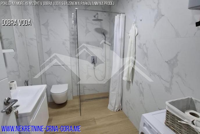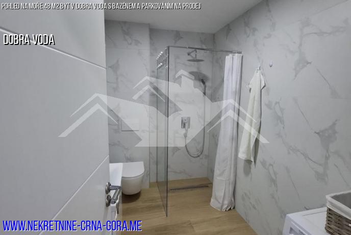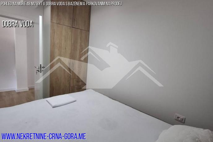 V horní části budovy se nachází bazén s panoramatickým výhledem na moře a okolí. Byt je vybaven kvalitním nábytkem a je vhodný jak k bydlení, tak k pronájmu.