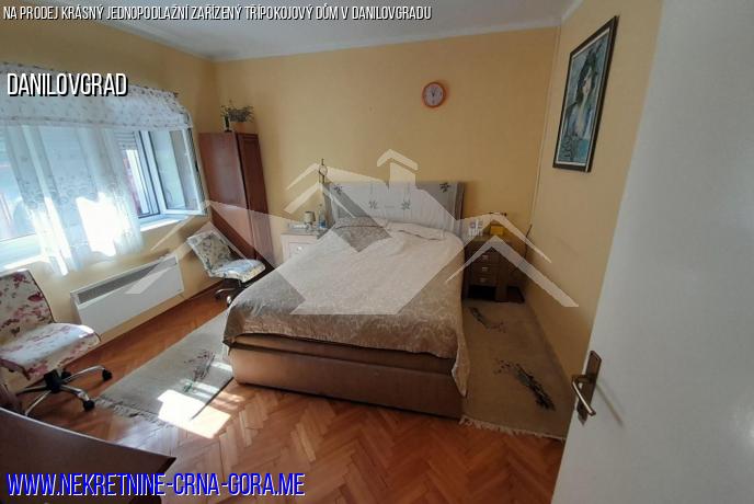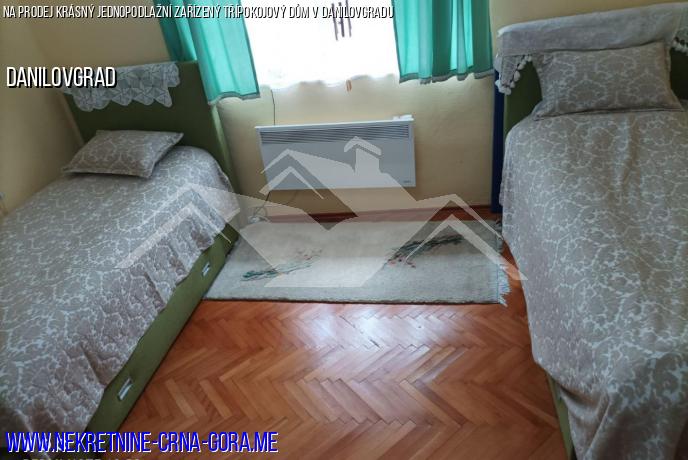 Majitel prodává komfortní, jednopodlažní, zařízený třípokojový dům v sousedství obce Danilovgrad, v lokalitě zvané Glavica. Dům je postaven na malém kopci s velmi příjemným klimatem, 700 m od centra města a 300 m od řeky Zeta.