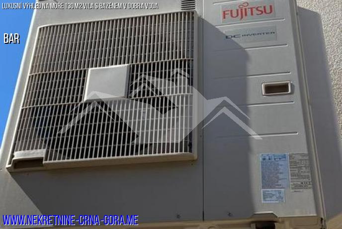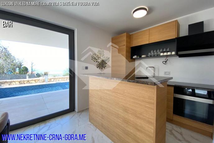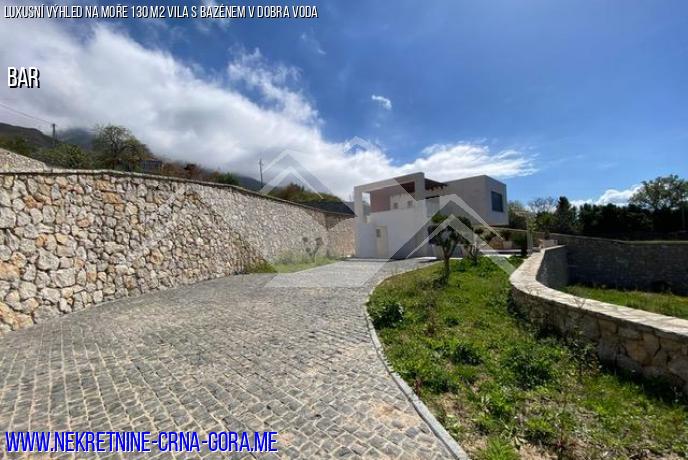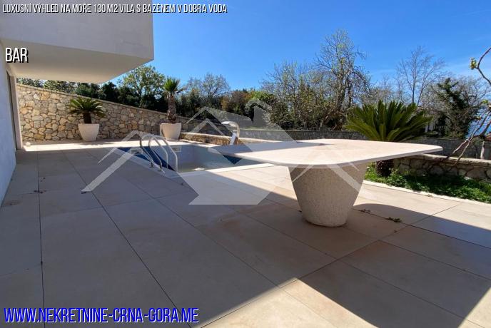 For sale: house in Dobra Voda, Bar with a beautiful sea view. The house is built to modern standards and includes a built-in split system, smart home features, and touch-sensitive electric shutters. There is a pool in front of the house. House area: approximately 130 m², plot area: 500 m². The house consists of a kitchen, living room, 3 bedrooms, 2 bathrooms, and a spacious terrace with a sea view.