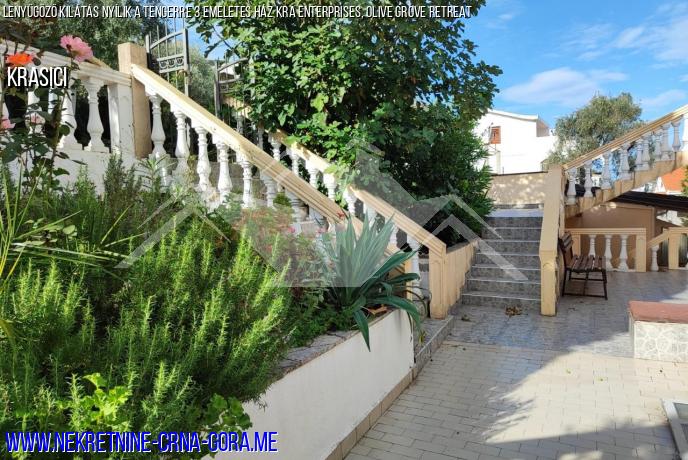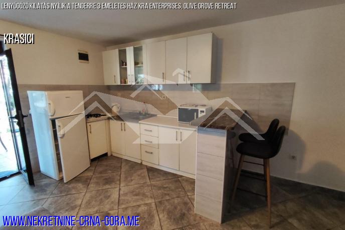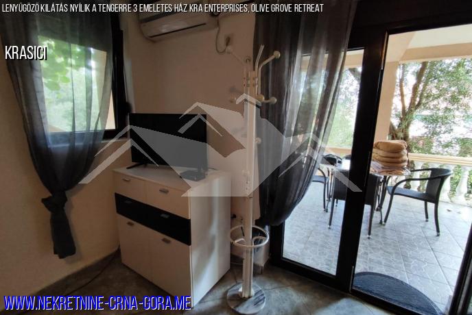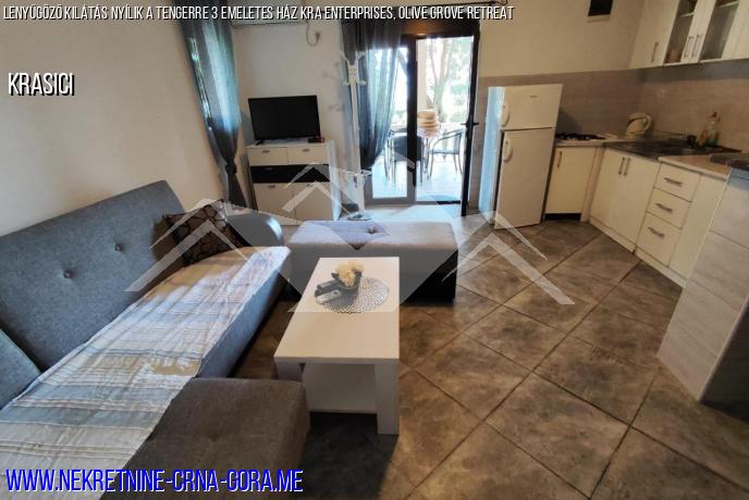 1. emelet: apartman 1 hálószoba, fürdőszoba, nappali kombinált konyha, erkély körül olajfák és kiwi.
