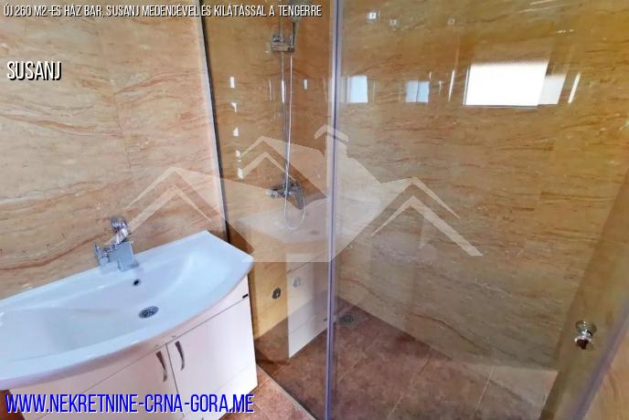 Új ház Bar, Susanj medencével és tengerre néző ház területe: 260 m2 telek: 590 m2 első emelet: nagy előszoba, nappali, étkező, vendég WC, öltöző és hálószoba. A második emeleten 3 hálószoba, egy nagy fürdőszoba szaunával, valamint egy öltöző található. A mosókonyha a legfelső emeleten található.
