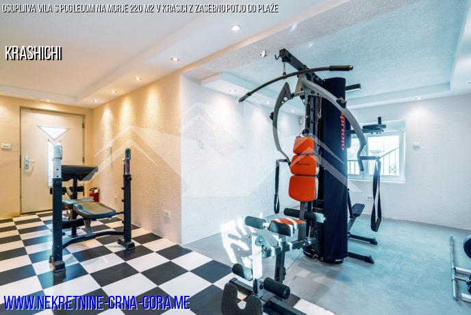 V pritličju je telovadnica, garaža in dve kopalnici.