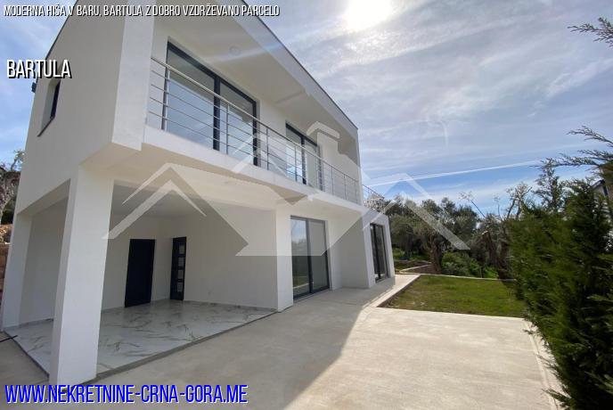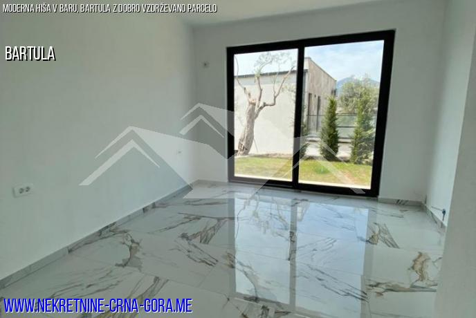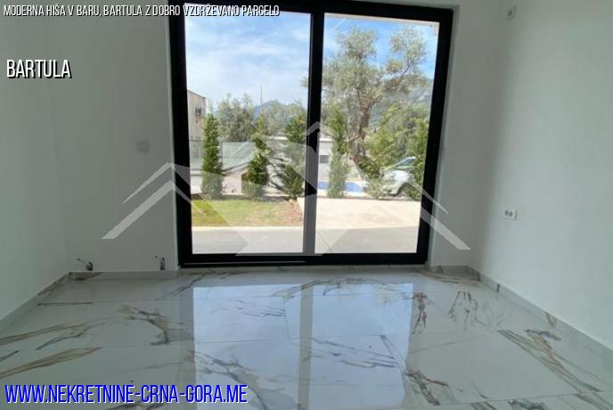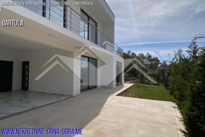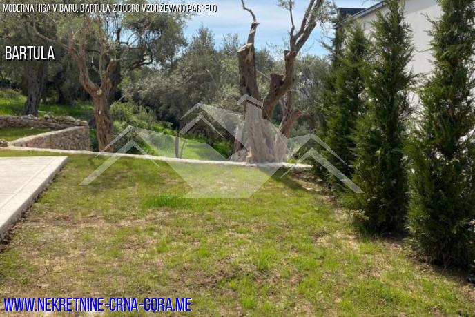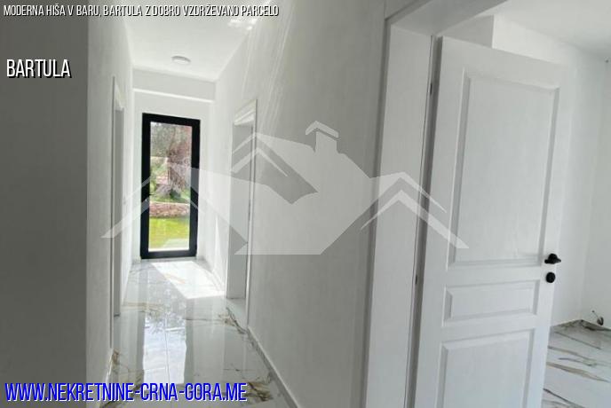 Za prodajo: sodobna hiša s površino 160 m2 v baru, Bartula. Hiša ima 2 nadstropji, tri spalnice, dnevno sobo in 2 kopalnici. Na parceli velikosti 360 m2 so oljke. Hiša je v zaključni fazi gradnje in ponuja odlično priložnost za dokončanje notranjosti po vašem okusu.