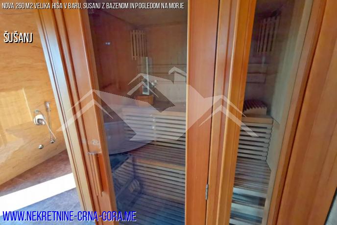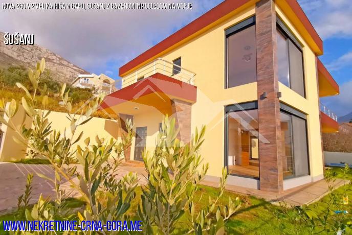 Nova hiša v baru, Susanj z bazenom in pogledom na morje površina hiše: 260 m2 parcela: 590 m2 prvo nadstropje: velika dvorana, dnevna soba, jedilnica, stranišče za goste, garderoba in spalnica. V drugem nadstropju so 3 spalnice, velika kopalnica s savno in garderoba. Pomožni prostor se nahaja v zgornjem nadstropju.