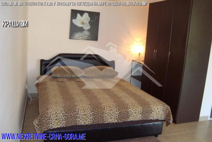 На првом спрату се налазе два гостињска апартмана: студио и апартман са одвојеном спаваћом собом, велика тераса. На другом спрату се налази кухиња са трпезаријом, комбинована са дневним боравком, купатило са туш кабином, спаваћа соба са излазом на велики заједнички балкон.