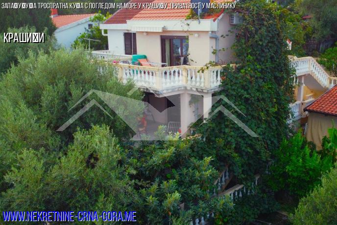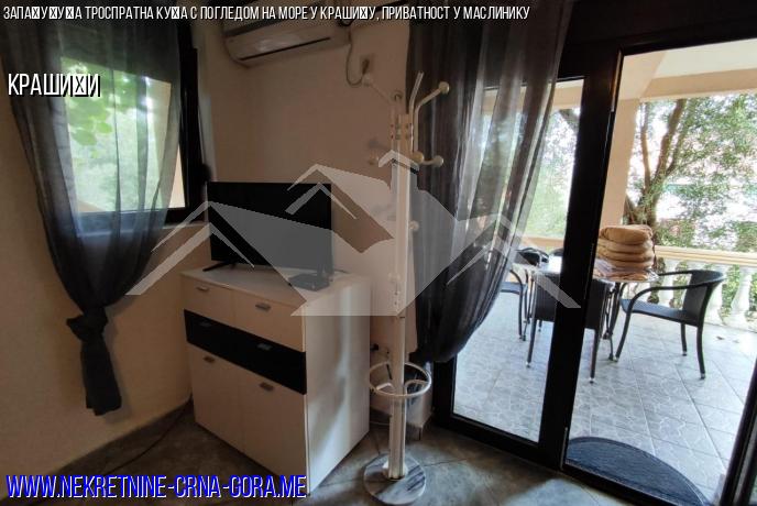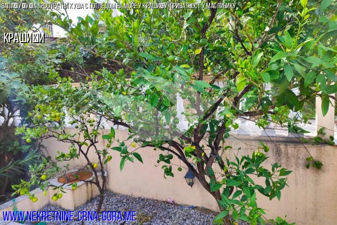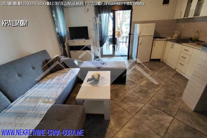 1. спрат: апартман са 1 спаваћом собом, купатило, дневни боравак у комбинацији са кухињом, гредом окруженом маслинама и кивијем.