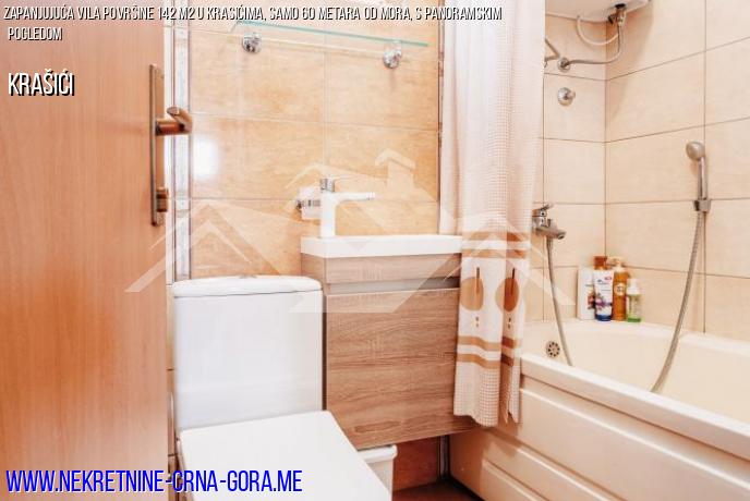 Prizemlje: predsoblje, kuhinja potpuno opremljena novim aparatima, prostrani dnevni boravak s kaminom, split sustav, toalet, prostrana terasa s namještajem od ratana proizvedenim u mn, prekrasan pogled na more , unutarnje drveno stubište.