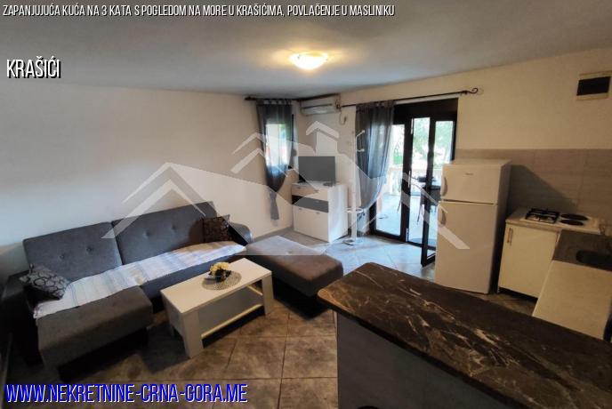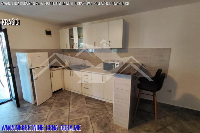 1. kat: Apartman s 1 spavaćom sobom, kupaonicom, dnevnim boravkom u kombinaciji s kuhinjom, gredom okruženom maslinama i kivijem.