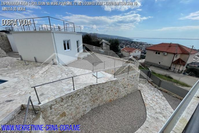Na prodaju je kuća u Dobroj Vodi s pogledom na more, Crna Gora. Kompleks se sastoji od pet novoizgrađenih jednosobnih kuća s prekrasnim pogledom na more. Potpuno su opremljeni i spremni za kretanje. Sve kuće imaju vlastitu krovnu terasu, privatnu