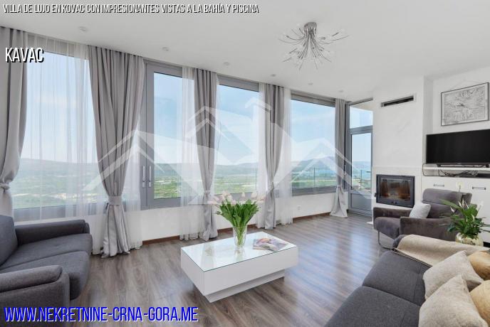 Sala de estar con magníficas vistas a la bahía de Tivat, ventanas panorámicas, equipada con chimenea, cocina con todos los electrodomésticos necesarios.