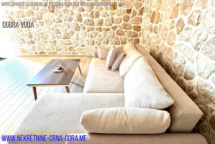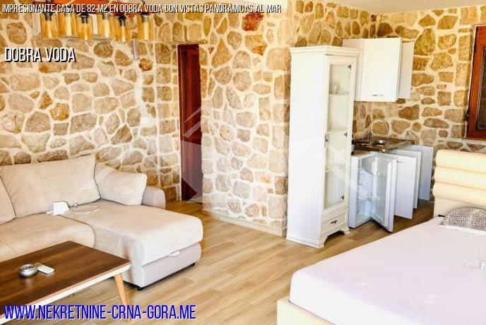 Se vende una nueva casa de piedra de dos pisos en Dobra Voda con vistas panorámicas al mar y las montañas.