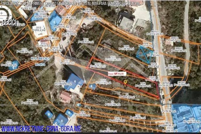 Se vende un terreno panorámico en Bečići con un área de 738 metros cuadrados/m para la construcción de un edificio de apartamentos.