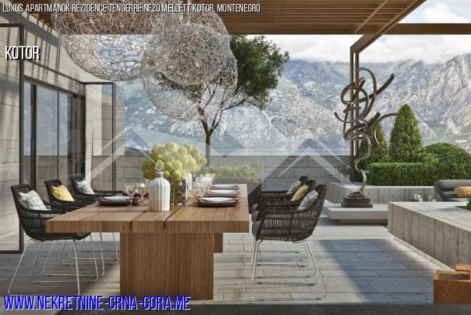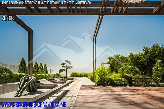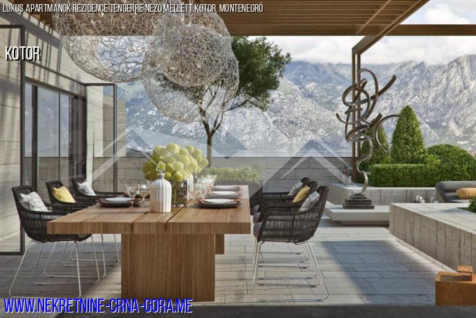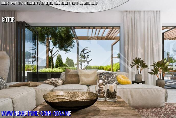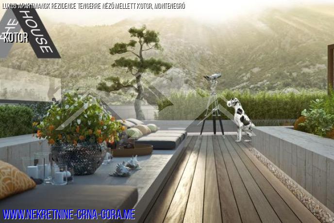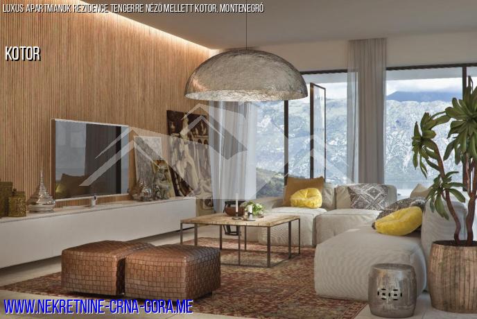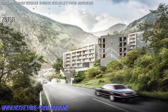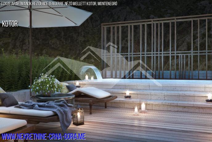 Apartmanok egy lakóépületben az Adriai-tenger Kotori-öbölének partján Montenegróban.