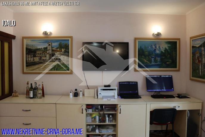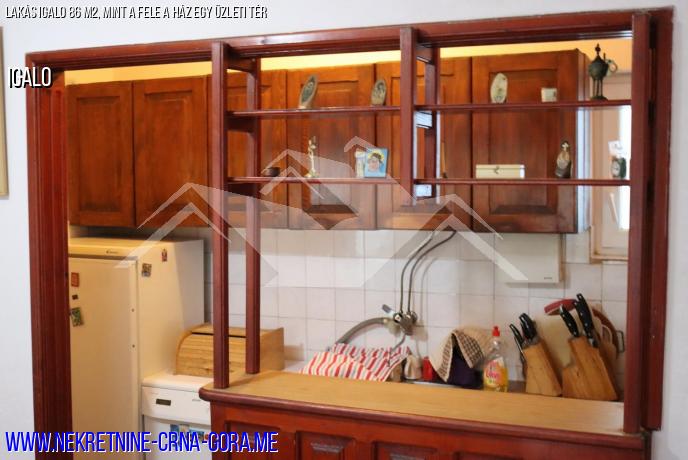 Eladó lakás (a ház fele plusz kereskedelmi terület) egy 86 m2-es kétszintes ház földszintjén.