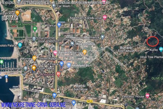 Zemljište s prekrasnim pogledom na bar i more. Postoji gradska voda i struja. Oblik parcele je trokutast, s malim kaskadnim nagibom.