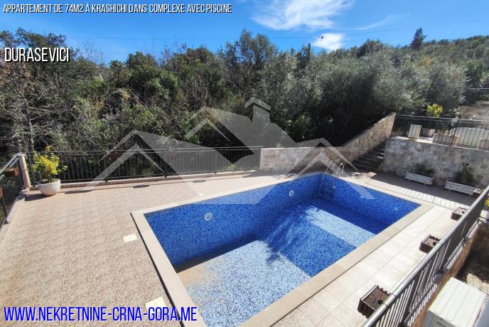 Dans un complexe avec piscine, un appartement de 74m2 est vendu au premier étage.