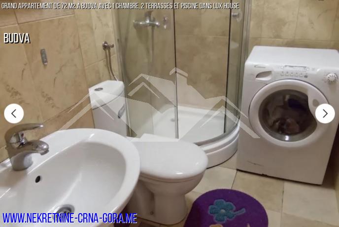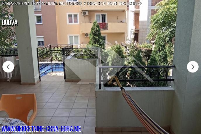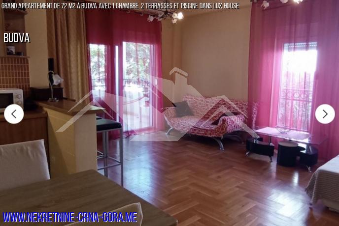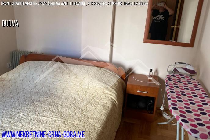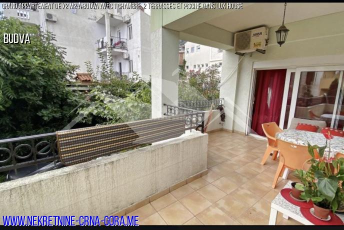 Appartement avec 2 chambres dans une maison de Club avec piscine à Budva. Appartement lumineux et spacieux, fenêtres battantes sur la cour et les montagnes, fenêtres panoramiques dans le salon.