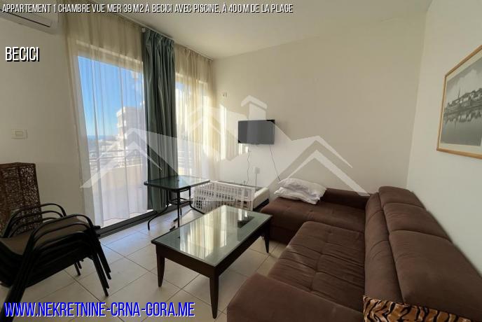 Appartement d'une chambre à Becici avec vue sur la mer et la piscine. La superficie de l'appartement est de 39 mètres carrés. L'appartement dispose d'une chambre, d'un salon avec cuisine et d'une terrasse avec une vue magnifique sur la mer.