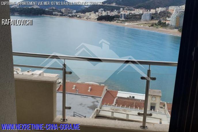 Salon, cuisine-salle à manger, deux chambres, deux salles de bains et une terrasse avec vue sur la mer